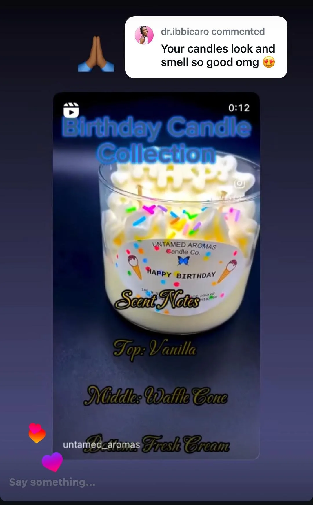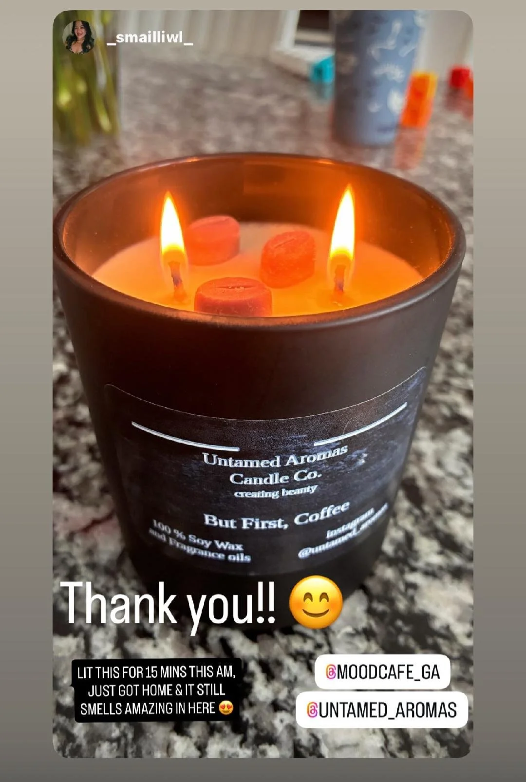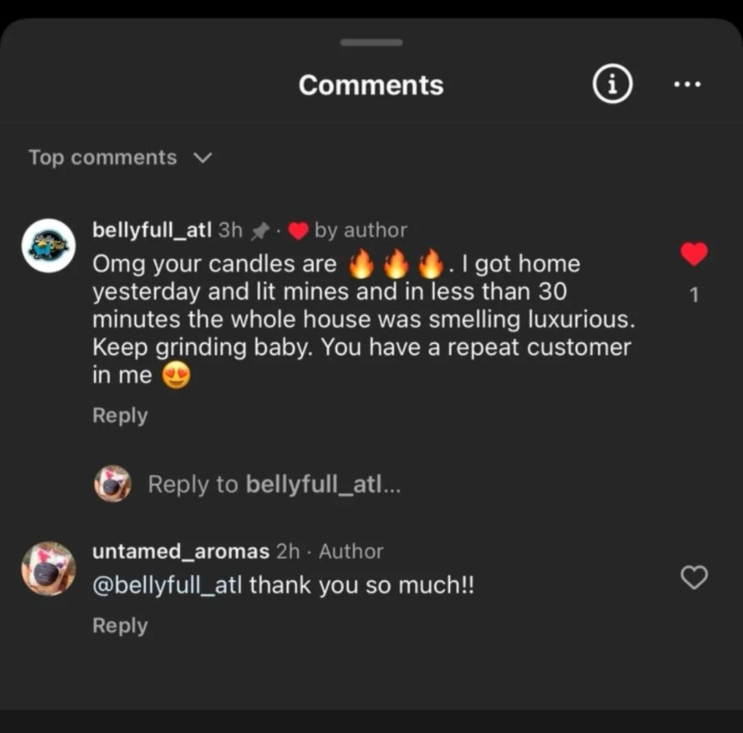 “Omg your candles are fire. I got home yesterday and lit mines and in less than 30 minutes the whole house was smelling luxurious. Keep grinding baby. You have a repeat customer in me.”